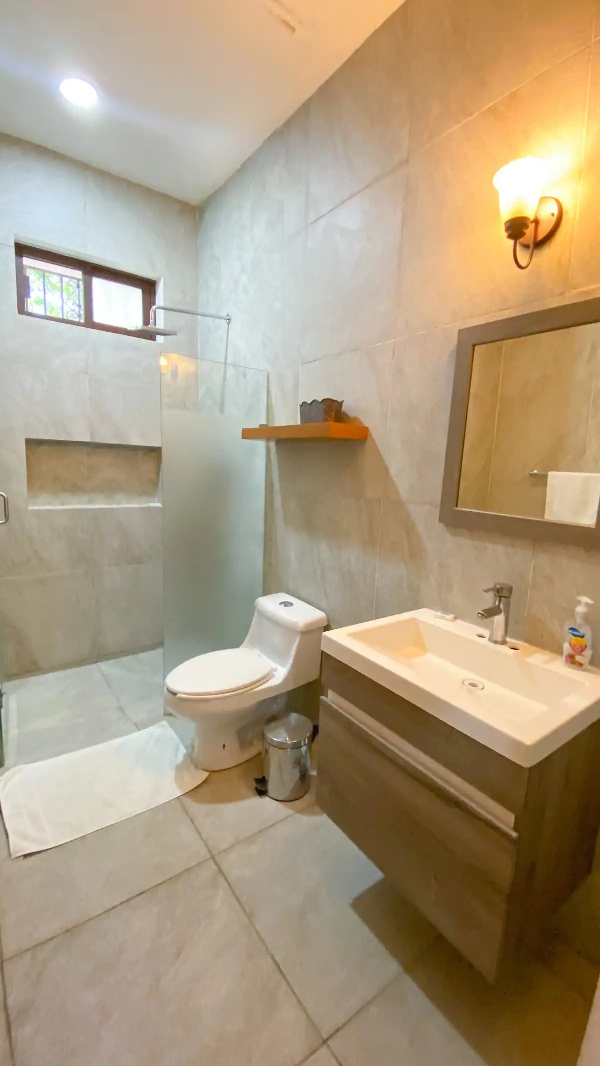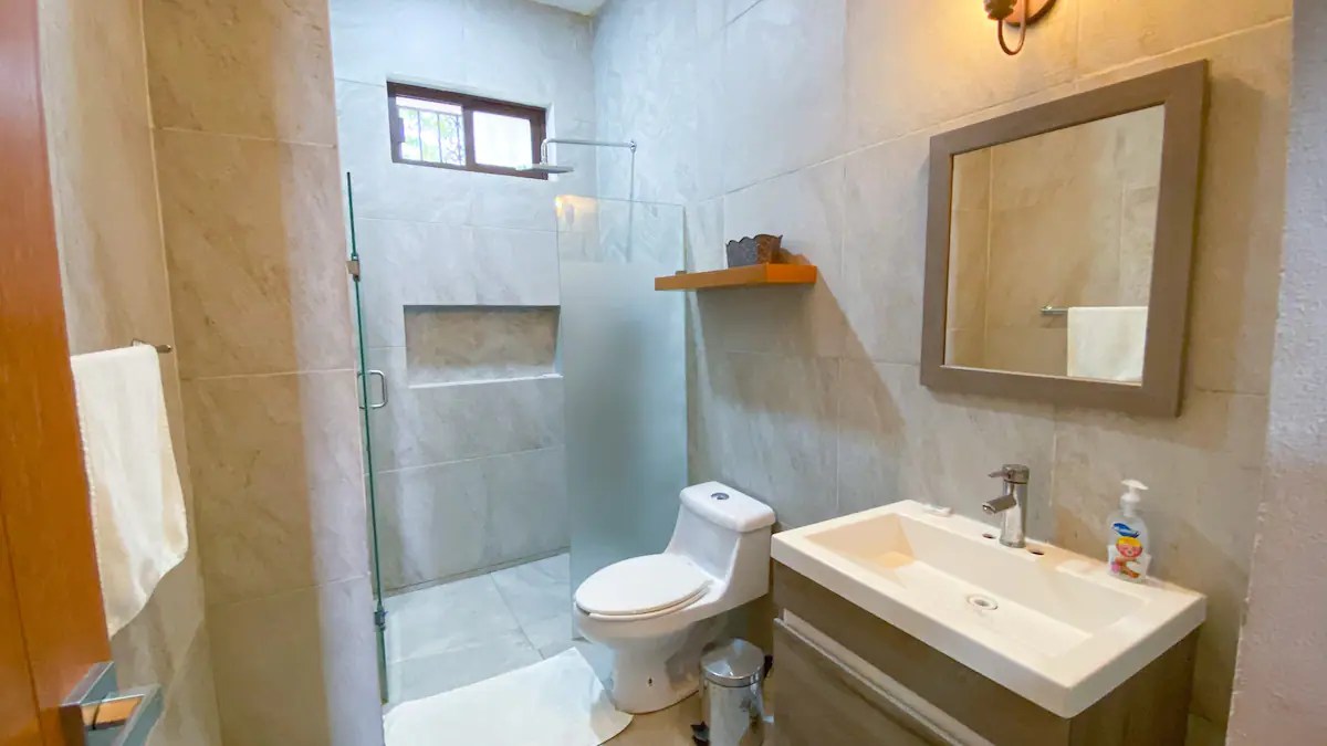 Este cuenta con 1 baño completo, 1 cuarto con cama queen size, sala de estar amplia con sofa cama, aire acondicionado, internet de banda ancha, pantalla de 43 ” en cuarto principal, pantalla de 60″ (ambas televisiones cuentan con Netflix para tu mayor confort), cocina equipada, área de trabajo.