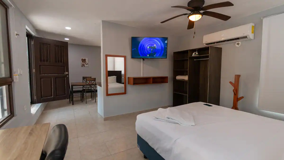 Este cuenta con 1 baño completo, 1 cuarto con cama queen size, large, aire acondicionado, internet de banda ancha, pantalla de 43 ” en cuarto principal, cocina equipada, area de trabajo, Parrilla privada en el exclusivo y comodo balcón donde podrás disfrutar de los hermosos atardeceres que esta terraza ofrece.